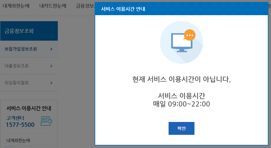 금융정보조회 메뉴에서는 보험가입정보, 대출정보 등을 조회해볼 수 있습니다. 주의할 점은 금융정보조회 서비스의 경우 매일 09:00시부터 22:00까지만 서비스 이용이 가능합니다.