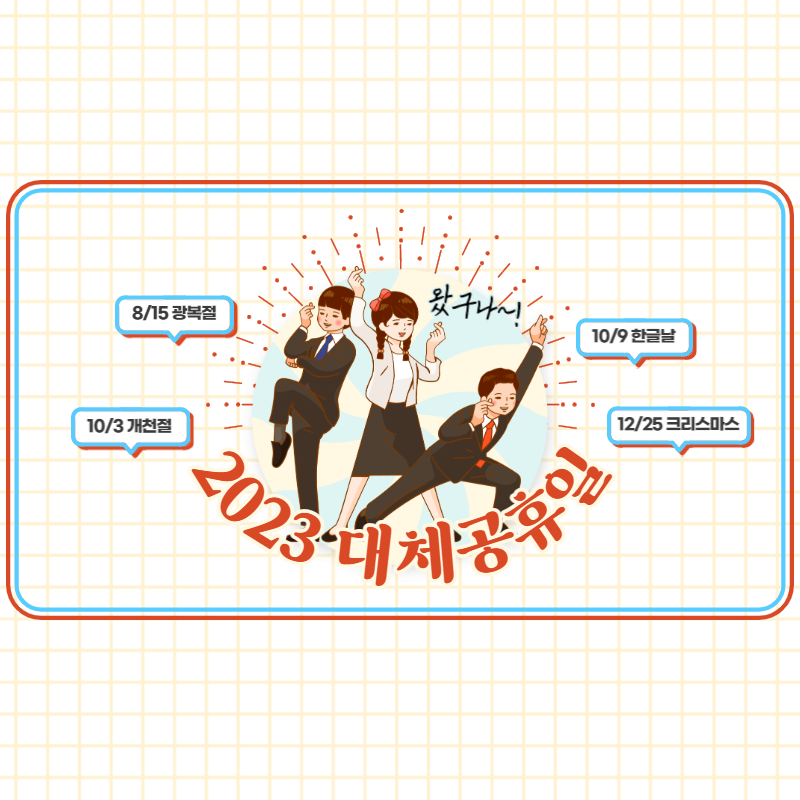 2023년 월별 공휴일과 대체 공휴일 일정을 정리해 드리겠습니다. 아직까진 대체공휴일이 하루 밖에 정해지지 않았는데요, 더 늘어나길 간절히 기도해 봅니다.